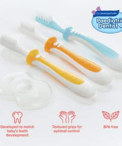 - Consists of Training Toothbrush Lessons 1, 2 and 3 to accompany baby’s oral care journey