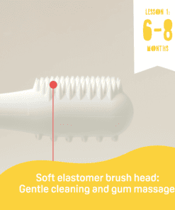 - Soft elastomer brush head gently cleans baby’s delicate gums and teeth