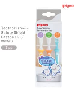 Co-developed with a leading paediatric dentist, the Pigeon Training Toothbrush Lesson 123 Set is the complete set of training toothbrushes your baby needs to pick up proper toothbrushing skills. For babies from 6-18 months. Lesson 1 – soft elastomer brush head allows the baby to clean their delicate teeth and gums without damaging them.Lesson 2 – soft elastomer bristle mimics those of a regular toothbrushLesson 3 – soft, rounded nylon bristles effectively removes food particles from their teeth